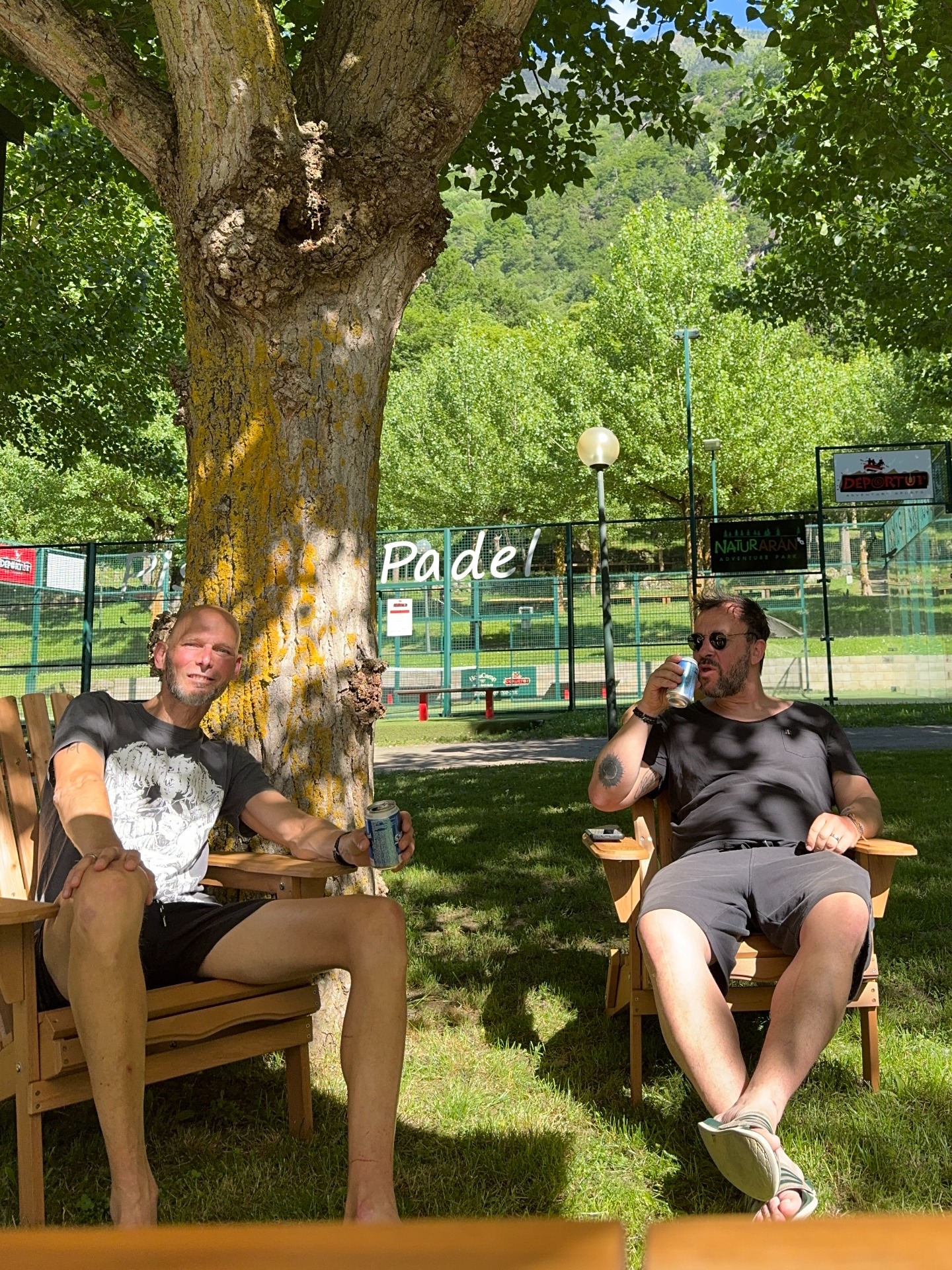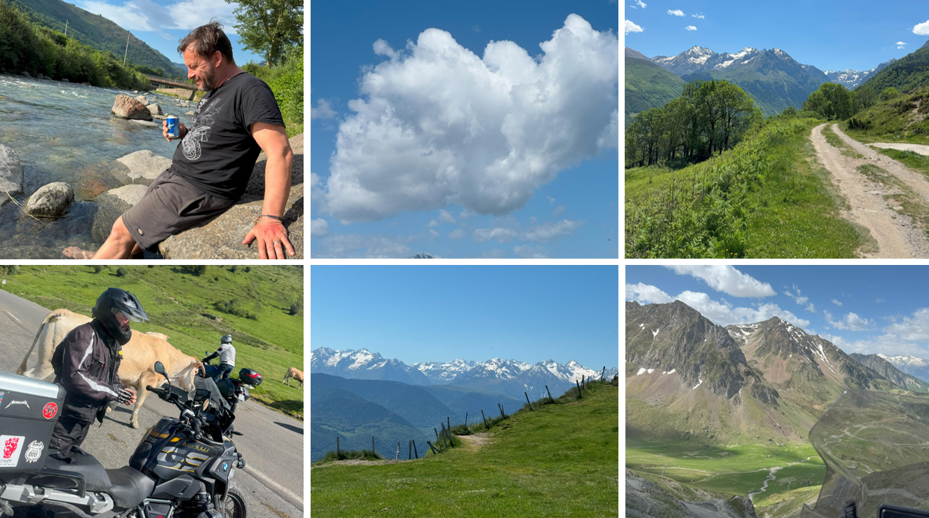 Heute Morgen schon mega geiles Wetter . Relativ spartanisches Frühstück, weil wir aber kein Brot bekommen hatten musste Zwieback herhalten, aber völlig genial dabei am Wasserlauf des Wasser plätschern zu hören. War heute Morgen auch kurz im Wasser gewesen und hab ne Sprachnachricht an die Familie geschickt. Einfach bloß mit dem Geräuschen des Wassers im Ohr nach dem Frühstück entspannt losgefahren. Es ging Richtung Frankreich , völlig gechillt und festgestellt, nachdem wir auf dem ersten Pass hochgefahren sind das es mega warm wird. Echt ein super warmer Tag, schon nach 1 Stunde Jacke ausgezogen, vom ersten Pass wieder runtergefahren und weiter weiter auf die nächsten Pässe, die alle durch Frankreich führten. Nicht besonders hoch, zwischen 1200 und 1500 m. Die Route war eigentlich zusammengestellt über ChatGPT und eigentlich ganz cool, aber manchmal schwierig zu bearbeiten, weil bestimmte Straßen genommen wurden, die ich so vermutlich nie gefahren wäre. Nachdem so die Hälfte des Tages rum war und wir auf einem größeren Pass ne Pause gemacht haben, habe ich von Hand eine andere Strecke programmiert, die richtig genial war . Wir sind dann sehr kleine Pass Straßen gefahren. Dabei sind wir auch an einem richtig wundervollen Stausee vorbeigekommen, wo von oben in den Bergen paar Gleiter gestartet sind. Unten im Tal haben wir dann die Möglichkeit genutzt auf französischer Seite mal mittags was zu essen. Super leckeres Baguette gegessen mit Serrano Schinken und bisschen Käse drüber. War auch genau richtig da dort mal was zu trinken und Cola ohne Zero zu sich zu nehmen. Man vergisst irgendwie während der Fahrt da nachzulegen. Danach sind wir dann noch ein bisschen auf der französischen Seite gefahren und wollten dann wieder nach Spanien rüber . Ich hatte eine Strecke zurecht gelegt und war dann sehr verwundert, als wir nur noch 25 km vor uns hatten und 60 Minuten angezeigt wurden. Die Lösung des Problems war einfach, diese Strecke war offroad und hat super Spaß gemacht. War natürlich bei knapp 30° auch super anstrengend und das schöne war, als wir dann runter gefahren sind war es nicht mehr weit. Wieder fühlt man sich natürlich großartig und super geil . Besonders das man so ne schwierige Strecke geschafft hat. Von der Offroad Strecke ging's dann zurück in unseren Ort, auf unserem Campingplatz,. Wir haben uns noch etwas entspannt, was zu essen gemacht und danach noch paar Bierchen getrunken. War schön, gab noch paar Tapas dazu im Dorf. Netter Wirt und entspannte Location gefunden dafür. Tour für morgen ist auch schon besprochen und programmiert. Bleibt nur noch ein Absacker und ein gutes Gespräch im dunkeln vor den Motorrädern.