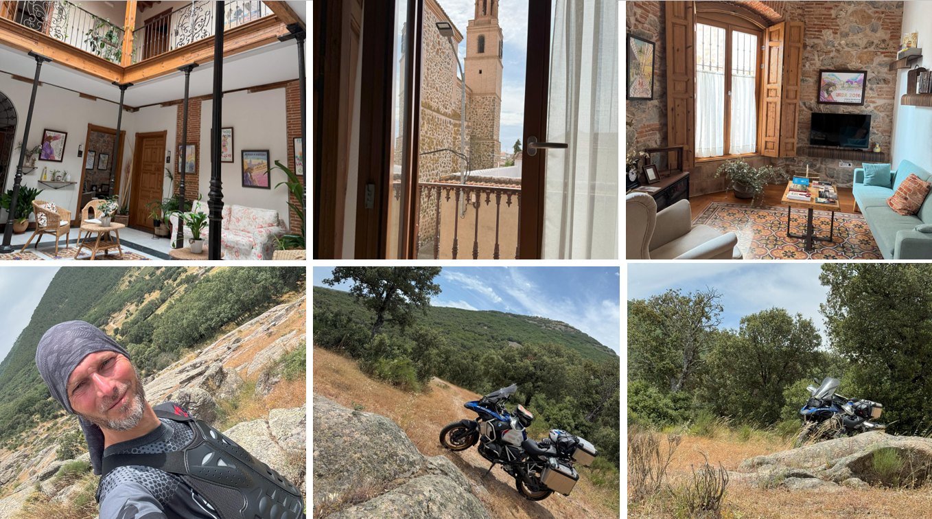 Eigenartiger Tag heute , zu wissen, dass Dorit und ich heute den 21. Hochzeitstag haben. Das ist mir gleich als erstes in den Kopf geschossen, als ich morgens eine Runde laufen war. Ich konnte auch gar nicht anders in dem Moment an einem schönen Ort anzuhalten und eine kleine Videobotschaft zu schicken. Zum Glück hatte Zoe das mit dem Blumen hinbekommen. Wunderbar. Nach dem Joggen, zurückgekommen von einer wunderbaren Strecke an einer Staumauer und über dem Dorf, packte ich meine Sachen und verstaute alles schon im Motorrad um dann zu frühstücken. Mein Gastgeber war sehr zuvorkommend machte mir einen frischen Kaffee und das Frühstück war für Spanisch Verhältnisse auch okay. Die Unterkunft im Ganzen war wunderbar, ein altes Steinhaus hergerichtet mit alten Balken und allem Komfort. Was man nach einer langen Motorradfahrt aber auch braucht. Selbst die Klimaanlage war so gut eingestellt, dass man sie fast gar nicht merkte und trotzdem wunderbar schlafen konnte. Der Tag begann dann erst einmal mit knappen 20 km Landstraße, ohne große Momente oder Kurven. Das änderte sich aber dann, als ich zu einem Berg hoch fuhr. Plötzlich waren da wieder die vielen kleinen Kurven und sehr schnell war man von 600 m auf 1500 m hoch. Als ich wieder runter fuhr, überquere ich eine weitere Ebene und befand mich dann in einer typischen Sierra Landschaft. D.h. auf einem Hoch Plateau knapp 1000 m. Rechts und links kaum Vegetation außer Olivenbäume. In dieser Hochebene ging es aber weiter zu einem Berg, die Straße kann man schon als Offroad bezeichnen, denn die war grottenschlecht. Das störte mich aber nicht, da ich ja mit dem Motorrad unterwegs bin und auf den Enduro Modus geschaltet hab. Sohabe ich ungefähr 20 km im Stehen verbracht. Ich stoppte da an einer Brücke um was zu trinken und merkte schon, dass der Tag heute sehr warm wird. Gegen 12:00 Uhr hatten war dann schon knapp 30° auf dem Thermometer. Meine nächste Sorge war eine Tankstelle zu finden. Das sollte sich noch als Problem rausstellen. Ich bin insgesamt sechs Tankstellen angefahren. Drei davon waren geschlossen an der vierten gab es nur Diesel und an der fünften funktionierte meine Kartenzahlung nicht. Endlich an der sechsten hatte ich Glück. Auch mit Kartenzahlung , aber ich konnte tanken und dann entspannt meine Reise fortsetzen. Ich bin einem wunderbaren Stausee vorbeigefahren, der vor allem von weitem eine tolle Optik bot. Dabei war zu sehen, dass der nur zur Hälfte voll war. Beim fahren hatte man das gar nicht gemerkt, weil man immer Wasser gesehen hat. Die Ränder waren da nicht zu sehen , da ich oberhalb des Sees gefahren bin. Von einem Hügel aus sah ich wie leer der eigentlich war. Ich fuhr dann weiter durch verschiedene kleine Ortschaften, die alle samt recht trostlos waren. Als ich in einen etwas größeren Ort kam, entschloss ich mich Wasser und Cola zu kaufen. Ich nutze die Gelegenheit auch gleich etwas zu essen. Das war eine gute Idee, denn bis zum Abend kam ich an keiner nennenswerten großen Ortschaft vorbei. Ich habe dann noch mehrere kleine Berge angefahren, diese umrundet oder überquert. Und bin dann schließlich in Urda in einem kleinen Hotel gelandet, welches direkt gegenüber der Kirche ist und eigentlich eine Pilgerunterkunft. Der Ausblick ist super schön. Auch das Hotel ist super schön und hat einen wunderbaren Innenhof wo man verweilen kann und kostenlos Kaffee und Wasser trinken kann. Des Weiteren gibt es eine kleine Bibliothek und die Zimmer sind auch sehr schön. Ich musste sofort an Dorit denken, dass dieses Hotel etwas für sie ist. Ich hatte mir dann nur etwas kleines zum essen gekauft und das im Innenhof zu mir genommen. Danach 1 Stunde mit Dorit gesprochen. Wir hatten uns mit Video zugeschaltet, so dass es schön war, nicht nur ihre Stimme zu hören, sondern auch ihr Gesicht zu sehen. Morgen werde ich versuchen, Richtung Valencia zu fahren und dort auf dem Campingplatz 2-3 Nächte übernachten. Ich bin mal gespannt, wie das Wetter morgen funktioniert, laut Satellitenbilder sollte genau über die Strecken immer wieder kleinere Gewitter auftreten. Das ganze bei 30°, da habe ich natürlich überhaupt keine Lust Regenkleidung anzuziehen. Na mal sehen, die Strecke ist bis jetzt knappe 7 Stunden vielleicht auch ein bisschen drüber. Sollte das Wetter richtig schlecht werden, müsste ich vielleicht doch mal die größeren Straßen nehmen.