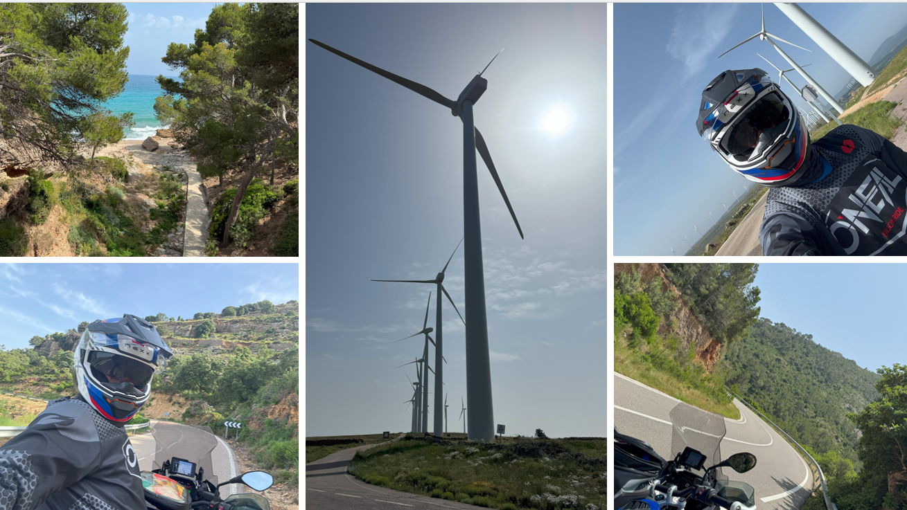 Xilles -Miami Platja . Nachdem ich zwei Tage Pause gemacht habe zum und nur zum Reifenwechseln das Motorrad bewegt habe ( waschen fahren zählt mal nicht), bin ich heute Morgen super früh wach geworden. Ich habe mich schon zu sehr gefreut aufs Motorrad zu steigen und einfach in die Berge zu fahren. Ich hab mir eine Route ausgesucht, welche fast nur aus bergauf - bergab bestand, kaum andere Strecken. Passt sehr gut da die Reifen eingefahren werden mussten. Das Thema hatte sich dann auch nach knappen 50, 60 km erledigt und die Seiten waren gut angefahren. Der Mittelsteg sowieso. Die Strecke war richtig genial. Es ging erst mit langen gezogenen Kurven los. Welche sich ablösen in kleine, sehr scharfe Kurven. Ich machte dann eine Pause in einem Kaffee in Villa Franca. Danach wurde es nur noch besser. Ich bin ein riesigen Windmühlen beziehungsweise Windräder Park oben auf einem Gipfel abgefahren. Das sah sehr spektakulär aus. Danach ging es weiter mit dem auf und ab . Viele kleine Orte, die ich vom weiten schon auf dem Berg sah und durch die ich immer meistens 10-15 Minuten später durchgefahren musste. Auf einem dieser Wege war auch eine Brücke. Diese Brücke war eingestürzt. Ich sah aber in den ausgetrockneten Flussbett, dass dort Autospuren beziehungsweise Reifenspuren waren. Deswegen fuhr ich die Böschung hinunter und folgte den Autospuren im Flussbett. Nach circa 6 km kam eine weitere Brücke die auch über die Böschung wieder erreicht werden konnte, so dass ich wieder auf einer festen Straße war. Das war wirklich spektakulär mal wieder im Flussbett zu fahren. Eigentlich nicht allzu schwer, da die Kiesel alle sehr fest waren. Nur manchmal, wenn größere Steine kam, wurde das Gewicht der Maschine einfach zu groß. Trotz alledem konnte ich das gut aus balancieren, war aber auch wieder froh auf der Straße zu sein. Danach fuhr ich entspannt weiter. Plötzlich sah ich, dass es nur noch 6 km bis zum Ziel am Meer waren. Vom Meer war aber noch nichts zu sehen und auch noch nichts zu riechen. Einige steile Kurven bergab, öffnet sie sich plötzlich die Landschaft, und ich konnte den Ort sehen, wo ich schlafen wollte. Angekommen packte ich wie immer erst mal kurz etwas aus und ging erst einmal eine Runde laufen, am Strand, beziehungsweise am Strand entlang. Danach sprang ich mit vollen Klamotten in eine Bucht. Das muss einfach sein. Zurück im Hotel duschte ich schnell und ging auch noch mal kurz in den Pool um danach kurz durch den Ort zu laufen. Ich fand ein kleines Lokal um etwas zu essen . Hatte festgestellt, dass ich öfter versuchen muss auch die lokale Küche mitzunehmen. Gehört auf so einer Reise dazu. Freu mich auch schon auf morgen, wenn es Richtung Barcelona geht. Habe mir auch eine sehr coole Route ausgesucht, die wieder nur in den Bergen ist und kurz vor Barcelona dann runterkommt. Wettertechnisch passt das auch soweit. Bin erfolgreich um einige Schauer drum herum gefahren. Bis auf den einen Morgen in den Pyrenäen null Wasser von ober. Außer Schwitzwasser am Rücken wenn mal ein Track schwierig war. Nehme ich aber gerne so mit. Das Hotel hatte auch einen Balkon wo ich noch lange sass und gelesen habe.