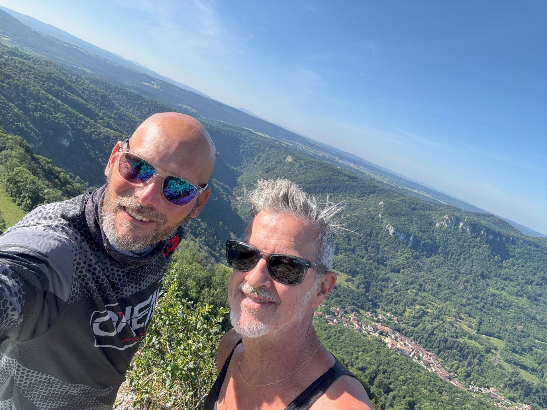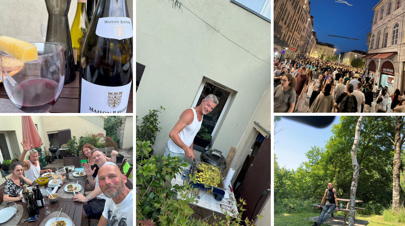 Nachdem es gestern Abend etwas länger bei Ronja war, bin ich trotzdem gegen 7:00 Uhr wach geworden. Habe mir entspannt einen Kaffee gemacht und die beiden schlafen lassen. Da ich ja wusste, dass sie gearbeitet die Woche über gearbeitet haben und ich die ganze Zeit schon im Urlaubsmodus bin., nachvollziehbar. Ich habe den beiden eine nette Nachricht hinterlassen und bin dann gegen 8:00 Uhr losgefahren. Der Weg Richtung Besancon war nicht sehr lang. Die ersten 30 km bin ich einfache Landstraße gefahren, um einfach erst mal rein zu grooven. Nach einem sehr kurzen Stopp, wo ich mir nur noch mal Wasser geholt habe, bin ich dann wieder auf die kleineren Straßen gewechselt. Das war wieder Mega schön . Nach ungefähr 130 km bin ich ständig zwischen der Schweiz und Frankreich hin und her gependelt. Ähnlich wie zwischen Spanien und Portugal verläuft hier die Grenze fließend. Aber nach einer Weile war ich dann nur noch in Frankreich. Machte dort an einem Fluss ein längerer Rast und programmierte den Rest Weg . So sollte ich gegen 15:00 Uhr da sein . Die Wege wurden manchmal sehr abenteuerlich , mitten durch den Wald. Dementsprechend waren die Straßen mal besser mal schlechter, aber alle sehr, sehr schmal. Die hohen Berge waren verschwunden, und Wälder haben die Landschaft abgelöst. Ebenso einige Felder, die schon abgemäht waren. Wir haben es zwar erst Mitte Juni, aber die erste Ernte scheint eingebracht. Die typischen großen Strohballen lagen wie kleine Ufos auf den Feldern. Ansonsten war die Fahrt einfach nur entspannt und nicht anstrengend. Genau so hatte ich's mir vorgenommen nach dem Unfall gestern. Ich bin dann auch kurz vor 15:00 Uhr in Besancon angekommen, habe noch für Pierre das versprochener Bier gekauft. Nachdem ich angekommen war, habe ich auf dem Hinterhof geparkt, das hatte Pierre wohl gehört und kam nach unten gelaufen und wir hatten eine sehr herzliche Begrüßung. Das ist etwas, was man erst einmal lernen muss, da genau genommen ich Pierre eigentlich nur einen Tag vorher gesehen hatte. Aber auch seine Tochter begrüßt mich und etwas später seine Frau. Wir verabredeten uns 17:00 Uhr zum Essen. In der Zwischenzeit habe ich geduscht, meine Sachen sauber gemacht und eigentlich die täglichen To-do`s erledigt. Dazu gehört auch immer den Helm und das Visier sauber machen und den Helm aufladen. Alles was sonst elektrisch nötig ist aufzuladen kann man auch gleich mal checken. Das einzige was ich heute nicht machen musste, ist eine Route für den nächsten Tag zu programmieren, da Pierre morgen mit mir fahren will und vorne fährt. Da er die Gegend kennt wird das spannend. Da bin ich mal sehr neugierig wie wir beiden harmonieren. 17:00 Uhr bin ich dann zu Pierre in das Hinterhaus. Sie haben eine sehr große Terrasse vor dem Haus. Aber ich war wieder erstaunt , genau wie beim letzten Mal, dass dahinter noch zwei weitere Häuser waren. Im Endeeffekt in einen Eingang sind vier Häuser ineinander gebaut. Wir versuchten uns wieder mit Händen und Gesten zu verständigen . Es ist halt schwierig , da Pierre wirklich wenig Englisch spricht. Aber später bekam ich mit, dass Pierre Deutsch spricht, da er in der Schule Deutsch hatte. Immer wieder blitzen deutsche Worte raus, so dass wir uns teilweise auf Deutsch besser unterhalten konnten als auf Englisch. Seine Tochter übersetzt hier und da auch wieder. Plötzlich kam ein Nachbar um die Ecke und setzte sich auch noch dazu. Pierres Frau kam auch mit an den Tisch, und wir zogen irgendwann in einer Art Chillecke um. Dort erzählten wir und starteten den Abend mit ein paar entspannten Getränken. Irgendwann sprang Pierre dann auf und sagte er macht jetzt Essen. Pierre hatte draußen eine Art Grillplatte, auf denen er frisches Gemüse und Fleisch zubereitete. Seine Frau hatte Humus , Zaziki und eine Art Pilzcreme gemacht und frisches Brot gebacken. Dazu, weil wir ja in Frankreich sind natürlich Wein . Der Nachbar mit seiner Frau kam dann auch vorbei, ebenso mit einer Flasche Wein. Das Essen war dann wirklich sehr lecker und entspannt und alle schnattern durcheinander. Ein komisches Gemisch aus Englisch , Deutsch und Französisch. Trotz alledem hatten wir uns dann irgendwie doch alle gut verständigen können. Zu meiner Überraschung holten am Ende des Essens, das natürlich mit einem Stück Käse und einem süßen Dessert beendet wurde, alle ihren Tabak raus und treten sich Joints. Das hatte mich dann doch etwas verblüfft, da, ich glaube, in Frankreich ist es noch nicht legalisiert. Danach sind wir noch in die Stadt gegangen, um von der Fete de la music noch etwas mit zu bekommen. Es waren einige Bühnen aufgebaut, die Mehrzahl der Locations waren aber DJs. Letztendlich haben wir noch ein paar Bier getrunken und ein bisschen erzählt, aber es war schon Wahnsinn, wie viel Leute auf der Straße waren. Vor allem sehr viel junge Leute haben das Event genossen. Wir sind dann gar nicht so lange später wieder zurück, da Pierre morgen früh um 8:00 Uhr losfahren will. Ich bin mal gespannt.