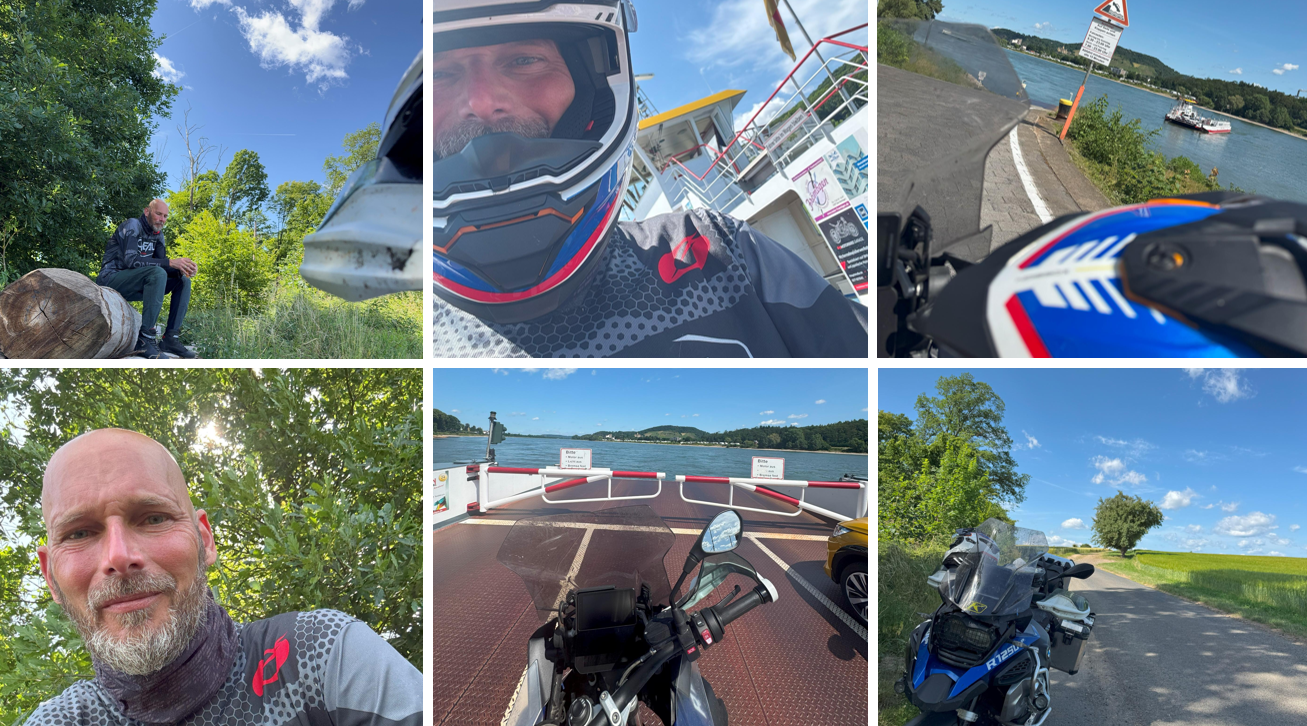 Bollendorf-Essen Heute ohne Frühstück gleich in die Berge der Eifel gefahren. Dafür aber die Übernachtung und das Abendessem for free weil die Rezeption echt chaotisch war. Entspannte lange Kurven, gleich zum Anfang mit der wunderbaren Abwechslung zwischen Feldern und Wäldern. Nach knapp 1 Stunde auf einer wunderschönen Parkbank, ein Brötchen und Kaffee zu mir genommen. Dann weiter Richtung Mosel. Immer wieder abwechselnd über Weinberge runter zur Mosel , hoch in die Weinberge und runter zur Mosel. Die Strecke hat super Spaß gemacht, war so gut wie überhaupt nicht anstrengend, da die Kurven alle sehr weitläufig waren. Dann rüber Richtung Bonn über einzelne kleine Gebirgsketten, dort wurden die Strecken etwas anstrengender, weil es durch viele kleine Dörfer ging und immer wieder Abschnitte waren, wo die Straßen sehr eng waren. Das bedeutet, dass man natürlich sehr vorausschauend fährt und versucht schon hinter die nächste Kurve zu gucken. Es wurde auch ziemlich schnell warm, so dass es mittags gegen 13:00 Uhr 30° waren. Ich habe meine Motorradklamotten noch einmal getauscht und das leichte Equipment angezogen. Alles in allen eine super entspannte Fahrt. Bis dahin zumindest, ein kleiner Bäckerstop und einen leckeren Apfelkuchen machten den Tag rund. Über den Rhein ging es dann mit einer Fähre, das war auch ein schöner Augenblick, gehört ja irgendwie auch zu Tour mit dazu. Also eine Flussüberquerung meine ich, und nicht über eine Brücke. Aber dann. Goethe hätte gesagt, die Schönheit hat ihren Namen abgegeben, als ich das Ruhrgebiet erreichte. Alles eine Katastrophe in grau. Wuppertal hat mich fast 45 Minuten gekostet, weil die Straßen alle voll und verstopft waren. Überall die typischen Trinker Hallen, Häuser mit Schieferdächern, oder Mini Reihenhaus Siedlungen. Kann man so komplett raus streichen diesen Teil der Tour. Aber ich wollte ja Uwe besuchen und freute mich schon ihn zu sehen. Als ich dann hinter Wuppertal wieder erwartend doch noch einige grüne Ecken an der Ruhr und ein paar Kurven und leichte Hügel fand, war das Ankommen sehr entspannt. Wir sind locker in einem Biergarten geschlendert und haben den Abend entspannt auf der Terrasse mit einem Wein ausklingen lassen. Morgen geht es nach Hause, das fühlt sich grad ziemlich komisch an, ich muss mal schauen welche Route ich nehme und ob ich es noch etwas hinauszögere.